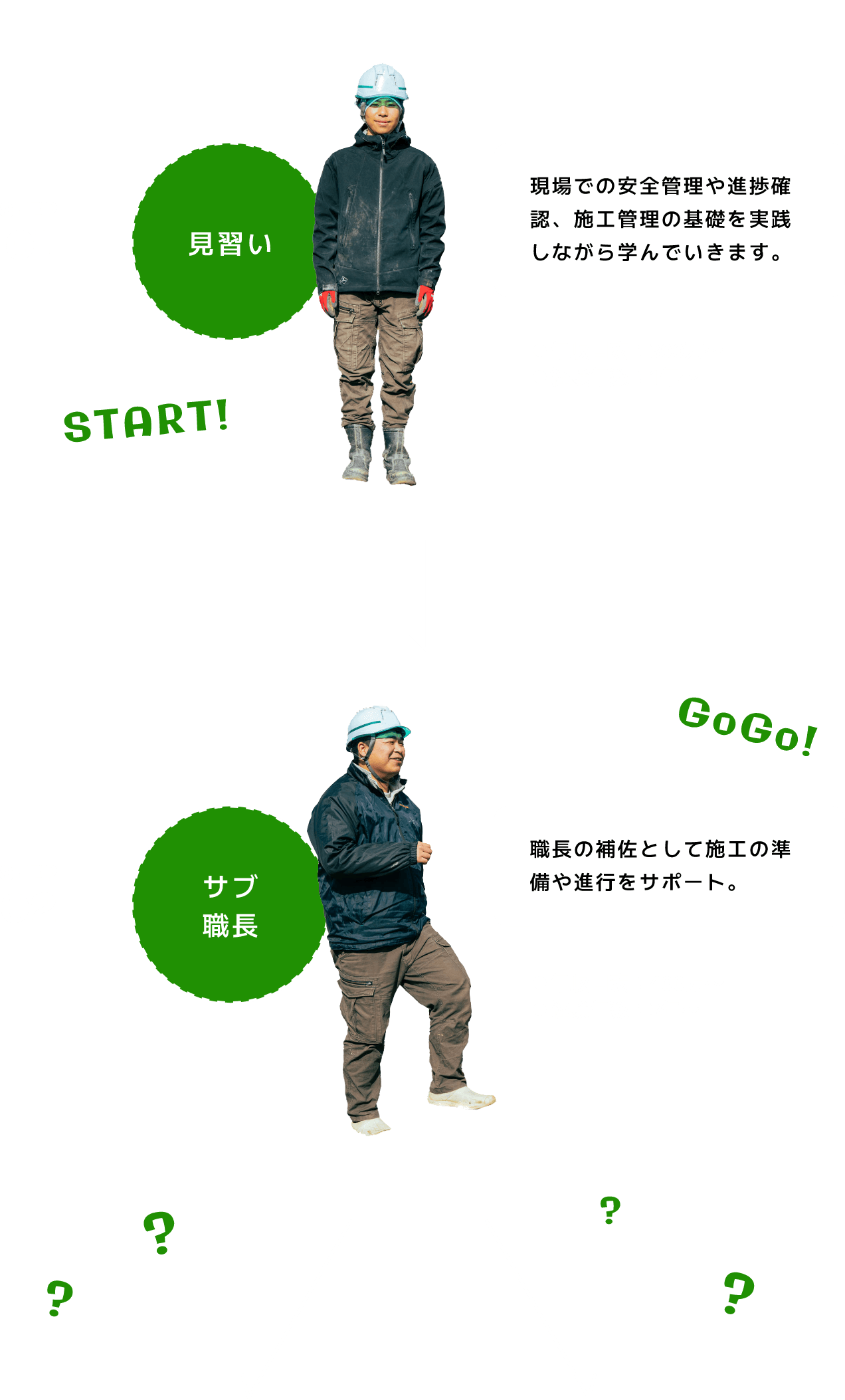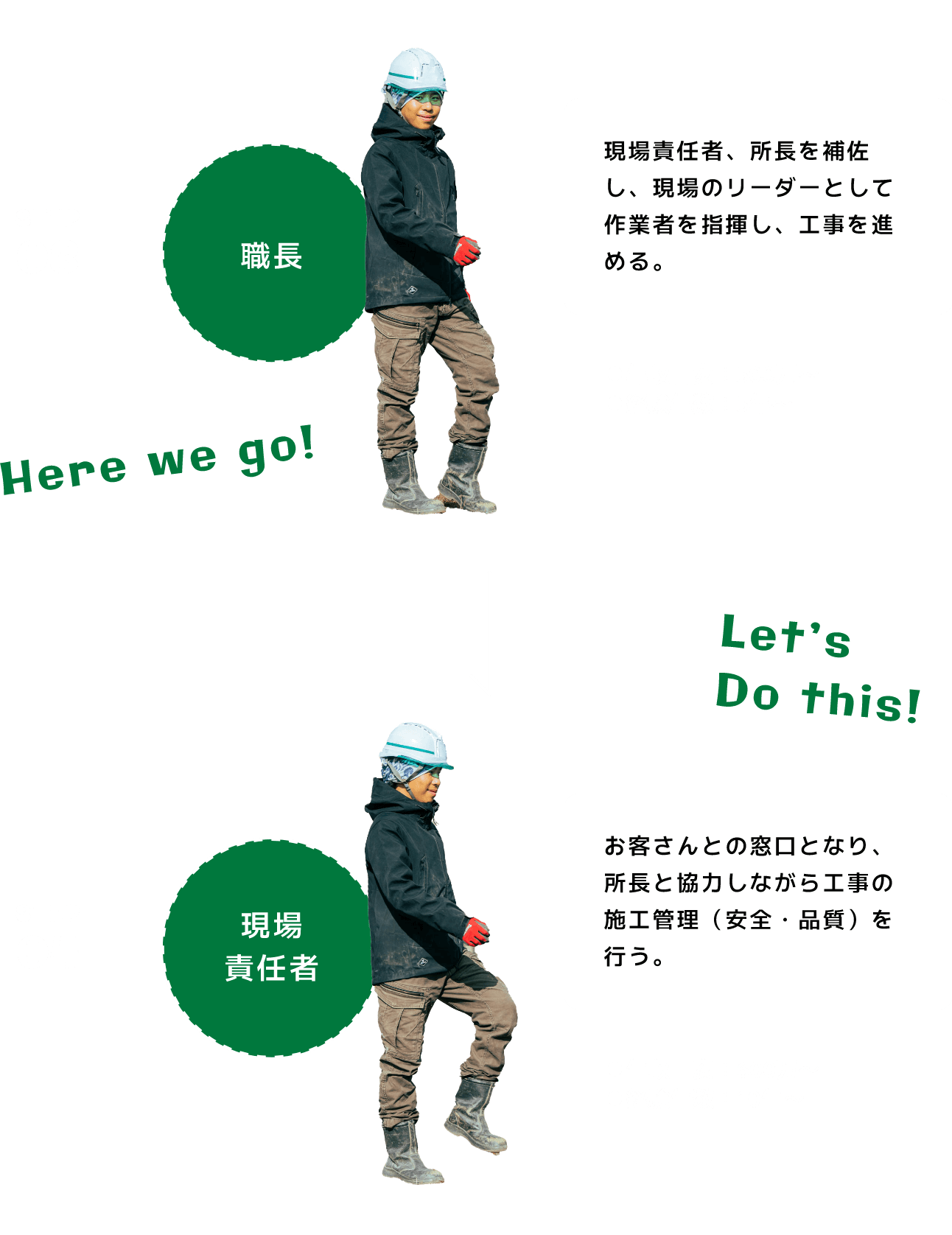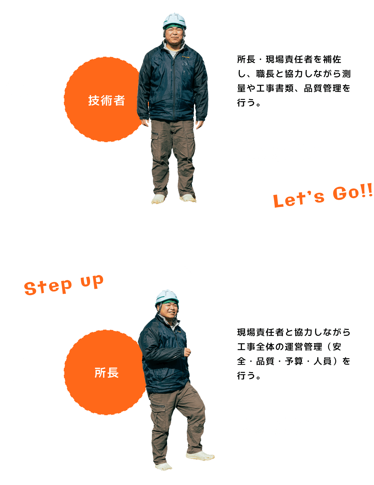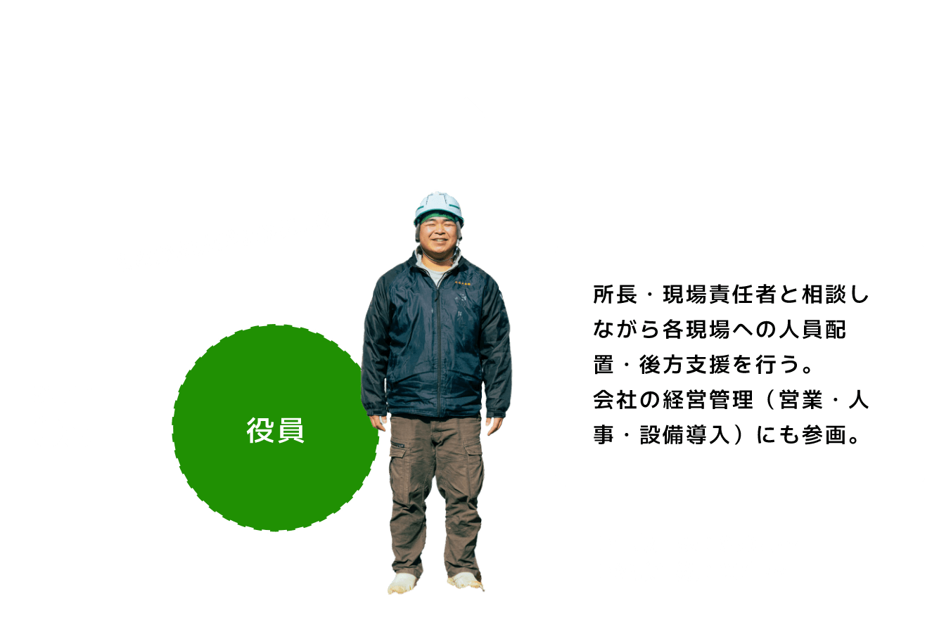 技能者・オペレーターとして入社したが、実際の現場を経験して「監督をやってみたい!」「監督志望だったが技能者の方が向いている!」など、元請として施工から管理を一貫して行っている為、様々な仕事に触れることができ、その中からそれぞれが得意分野を見つけることができるのが弊社の強みです!