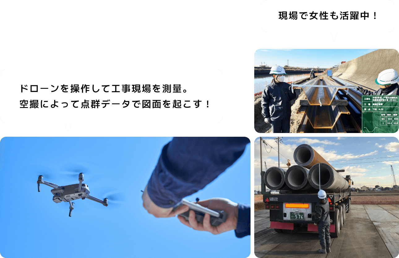 ドローン測量や3D設計など最新技術を扱えるのも魅力。若手や女性が活躍できる新しいポジション。