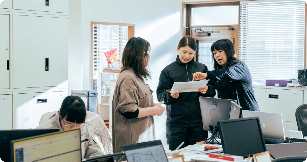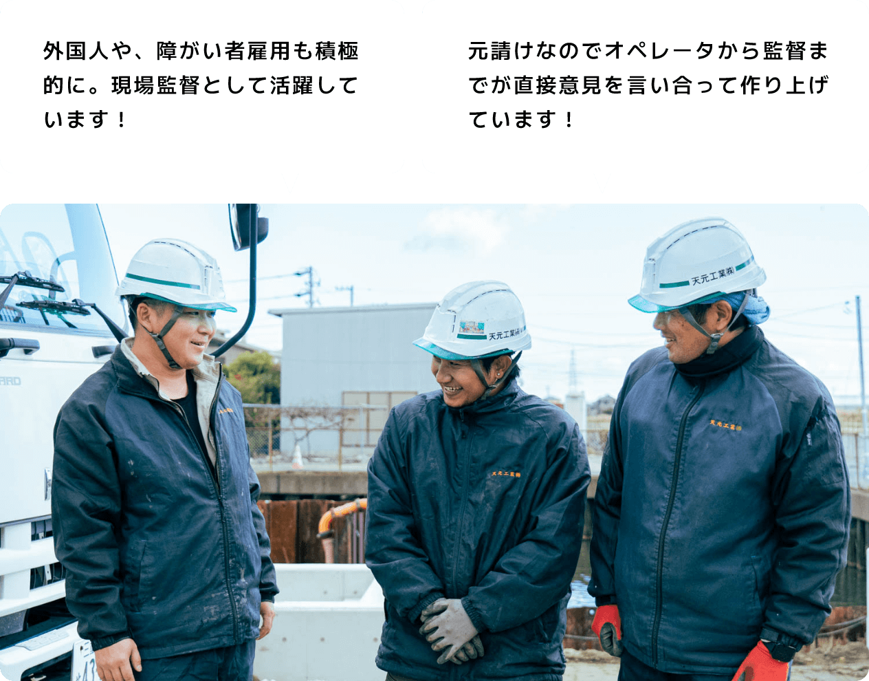重機オペレーターから監督までが現場で意見を交わし、一丸となって進める「現場主義」。安全第一を徹底し、ベテランが新人を見守りながら技術と心を継承します。地上からは見えない設備にも妥協せず、美しく丁寧な施工を追求。