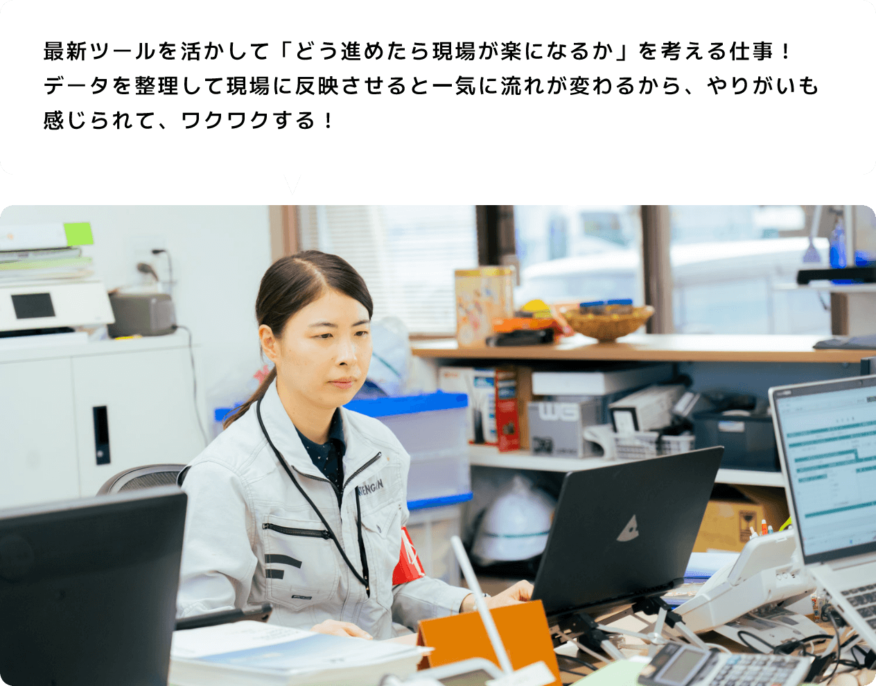 建設ディレクターは、現場とオフィスをつなぐ“橋渡し役”。書類作成やICTの導入サポートで技術者を支え、プロジェクト全体をスムーズに進める役割を担う!